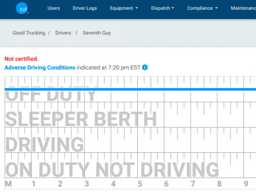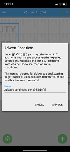 When the driver indicates these conditions in the app, we include the appropriate annotation in the data file sent to the FMCSA, noting the regulatory basis for the extension. The driver can also add to the note with the reason for claiming adverse conditions.